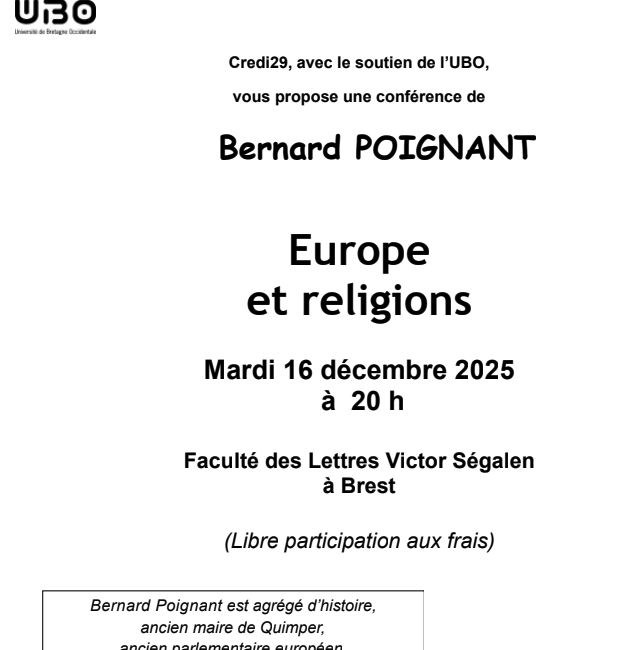 La prochaine conférence du Credi aura lieu le mardi 16 décembre à 20 h sur le thème : « Europe et religions » , par Bernard Poignant. Ce sera, comme d’habitude, dans [...]