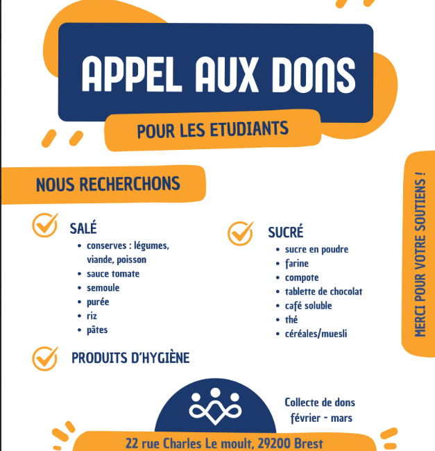 L’association Espérance Jeunesse Brest propose aux étudiants en difficulté des dons de première nécessité afin de leur permettre de vivre dignement. Actuellement, nous avons 80 bénéficiaires, cependant nous manquons de [...]