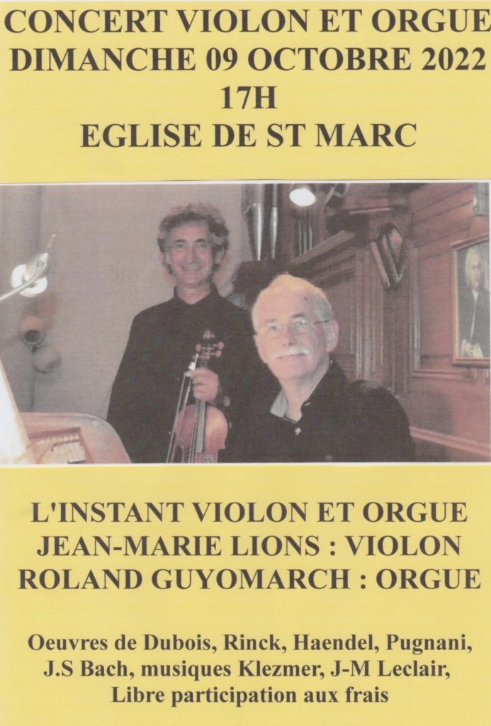 Dimanche 9 octobre 2022, à 17 h, l’église de Saint-Marc accueillera le duo brestois l’Instant violon et orgue, composé de Jean-Marie Lions au violon et de Roland Guyomarch à l’orgue.