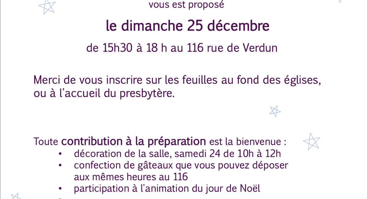 Un Goûter de Noël est organisé le dimanche 25 décembre de 15h30 à 18h au 116 rue de Verdun pour les personnes qui souhaitent partager un moment festif et convivial.