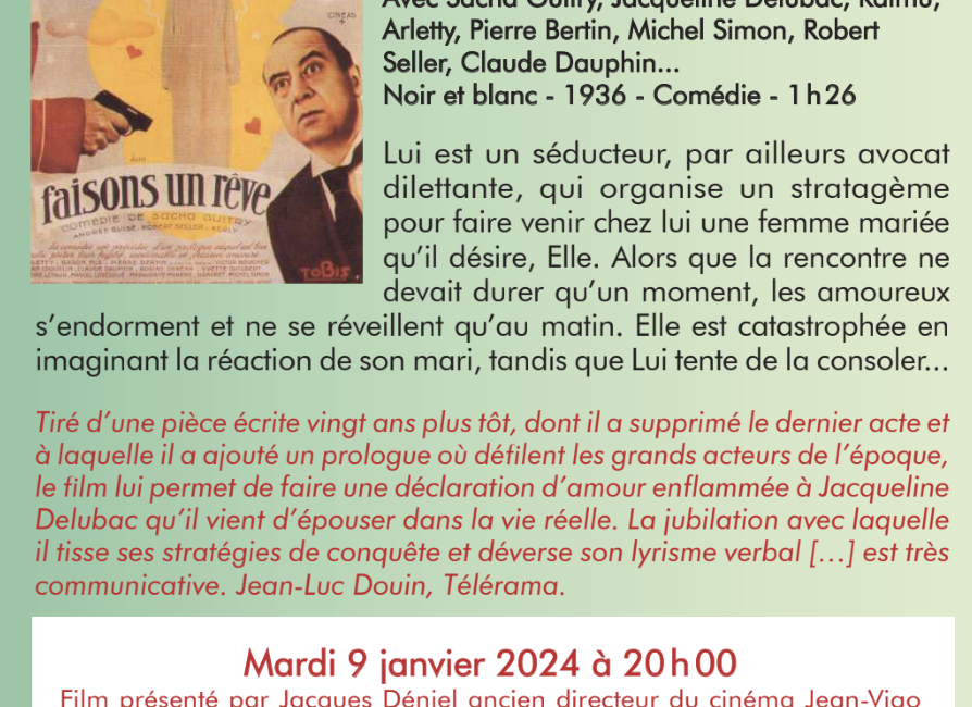Mardi 9 janvier 2024 à 14h et 20h au cinéma les Studios à Brest: Faisons un rêve de Sacha Guitry présenté par Jacques DénielFrance – 1936 – noir et blanc – comédie – 1h26Interprétation: [...]