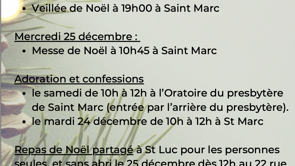 Vus trouverez ci-joint les horaires des messes de fin d’année. A noter la proposition de repas partagé le 25 décembre midi à St Luc. Belle avancée dans l’Avent !