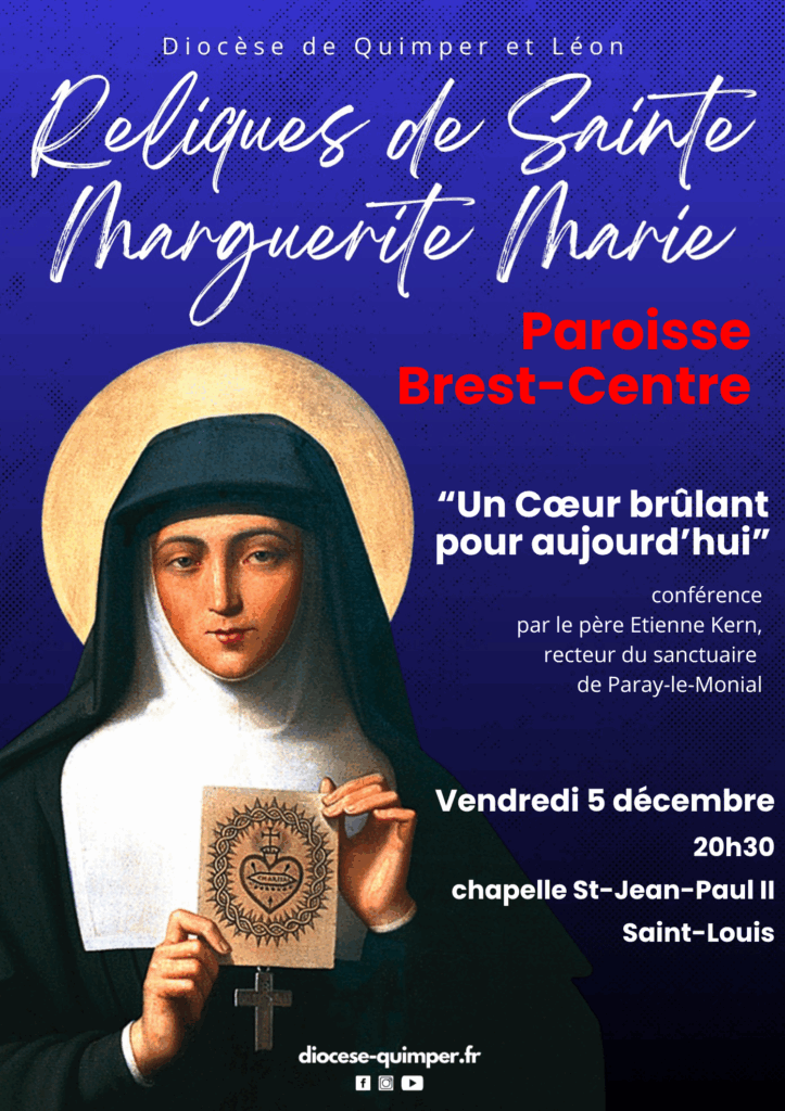 Dans le cadre du renouvellement de la consécration du diocèse au Sacré Cœur de Jésus (le 14 décembre à Quimper) et de la pérégrination des reliques de sainte Marguerite-Marie Alacoque dans la paroisse Saint Louis, le recteur du sanctuaire de Paray-le-Monial donnera une conférence ayant pour le thème « un Coeur brulant pour aujourd’hui ». Cette conférence aura lieu à 20h30 le vendredi 5 décembre à la chapelle Jean-Paul II à Saint Louis .