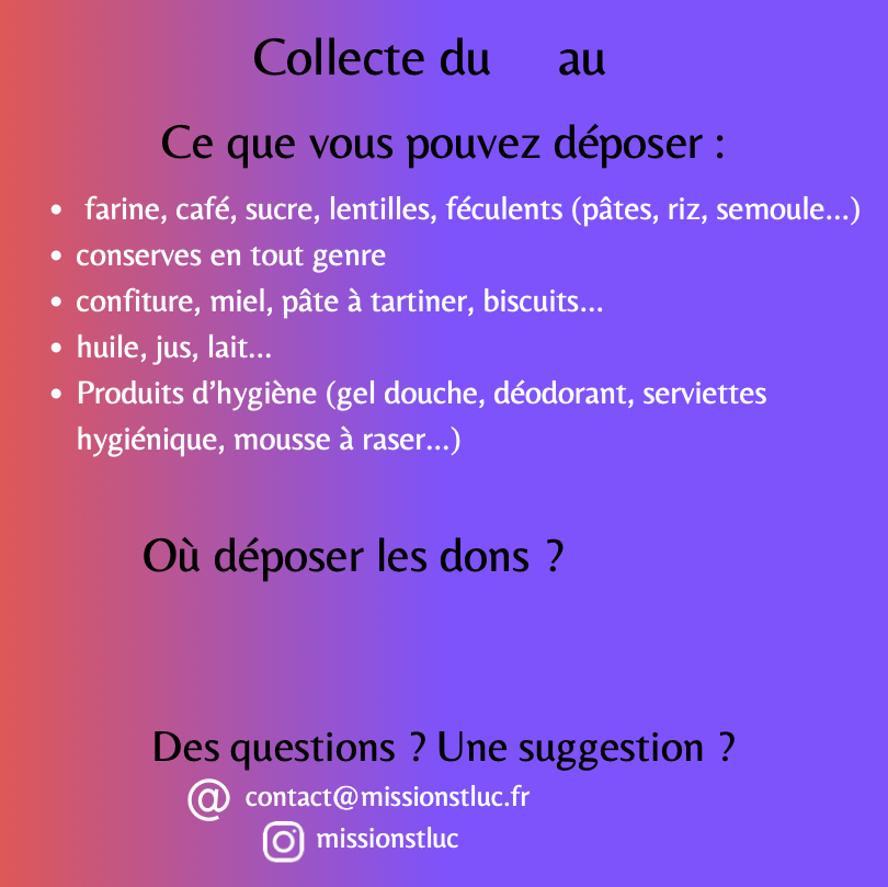 Mission St Luc doit renouveler les stocks, les besoins sont les suivants: