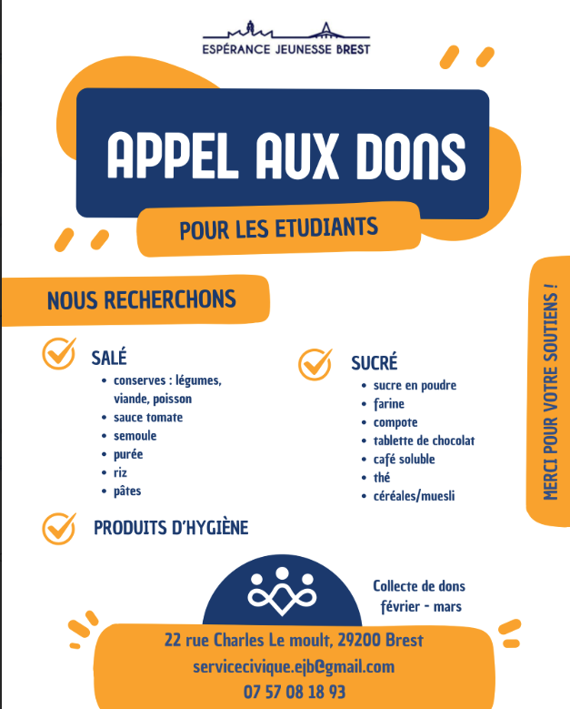 L’association Espérance Jeunesse Brest propose aux étudiants en difficulté des dons de première nécessité afin de leur permettre de vivre dignement.