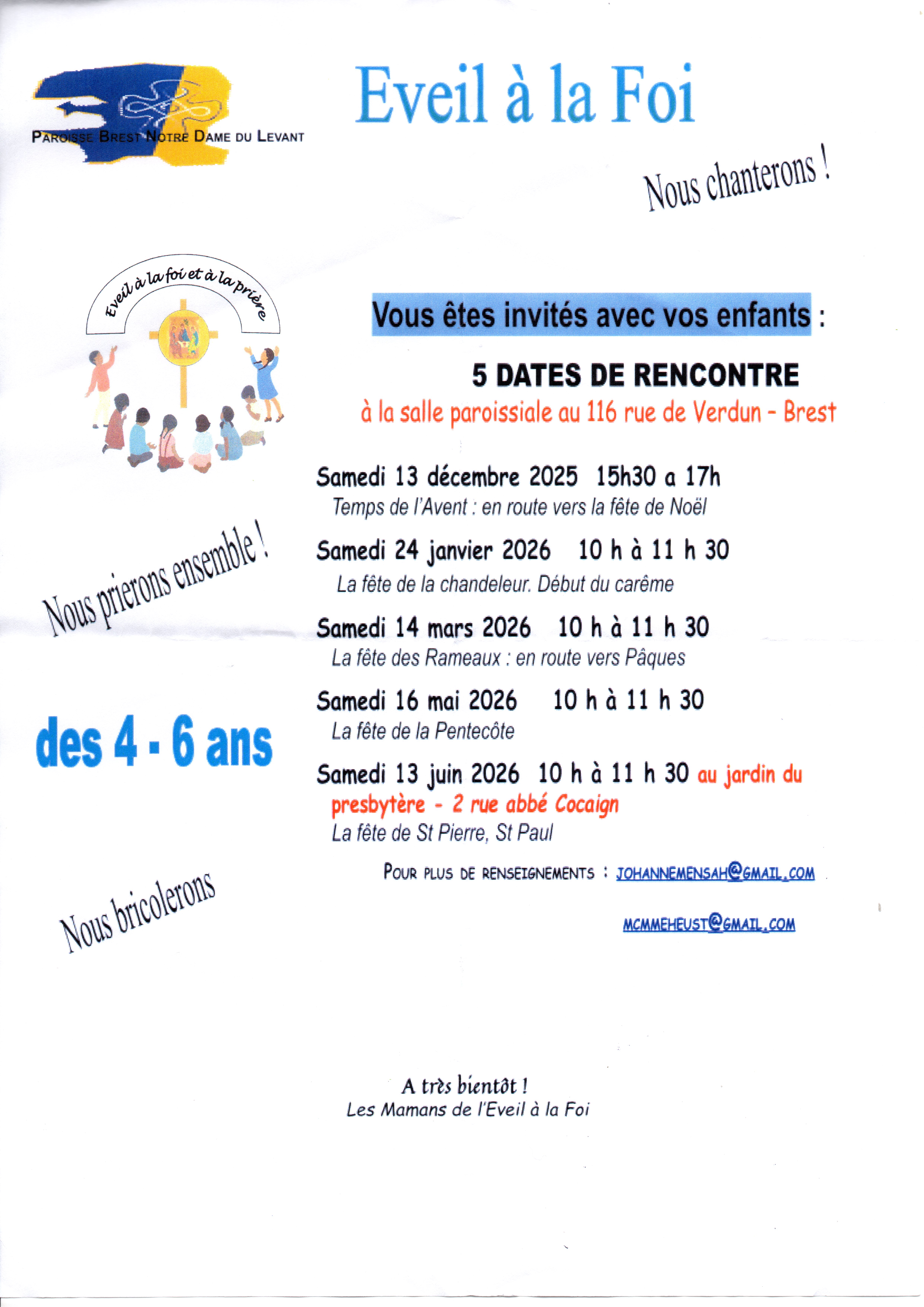 Une nouvelle rencontre est proposée aux enfants de 4 à 6 ans le samedi 13 décembre de 15h30 à 17h sur le thème « Temps de l’Avent : en route vers la fête de Noël ».