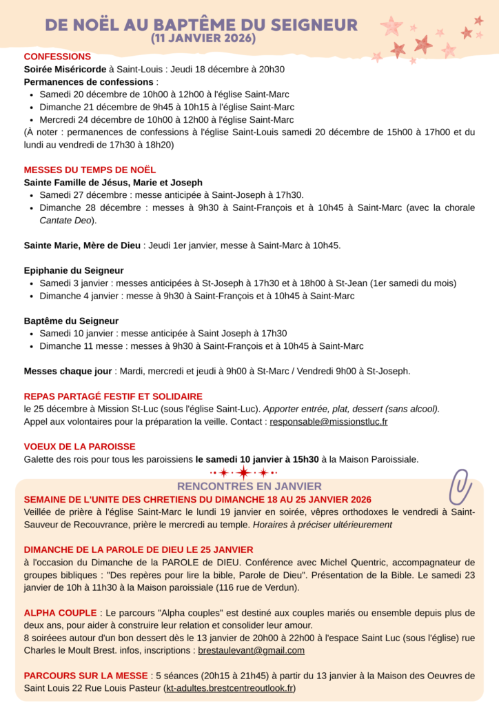 Horaires des messes – Temps de Noël jusqu’au baptême du Seigneur