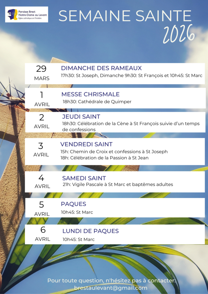 Retrouvez les horaires 2026 de la semaine sainte pour la Paroisse Brest au Levant de Brest.
