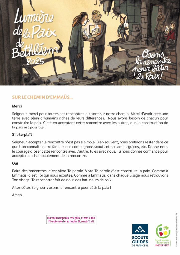 Elle est ouverte à tous les paroissiens qui le souhaitent et ils pourront récupérer la lumière de la Paix de Bethléem. Pensez à prendre vos lumignons ou bougies.