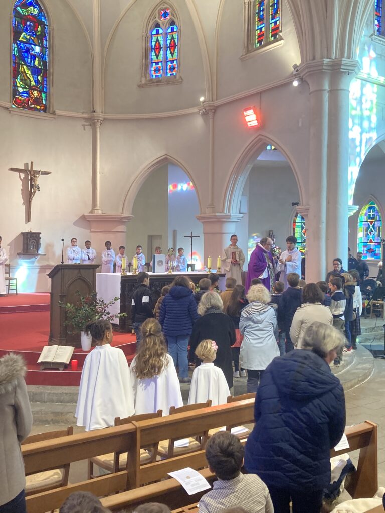 Ce 1er dimanche de l’Avent, messe des familles, les jeunes se préparant à recevoir leur toute première communion ont reçu la croix de leurs catéchistes.